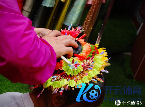 头发梳成螺旋发髻,横插象牙筷固定,再围绕发髻簪满素馨、茉莉、三角梅等鲜花,瞭望如同 “行走的花坛”。