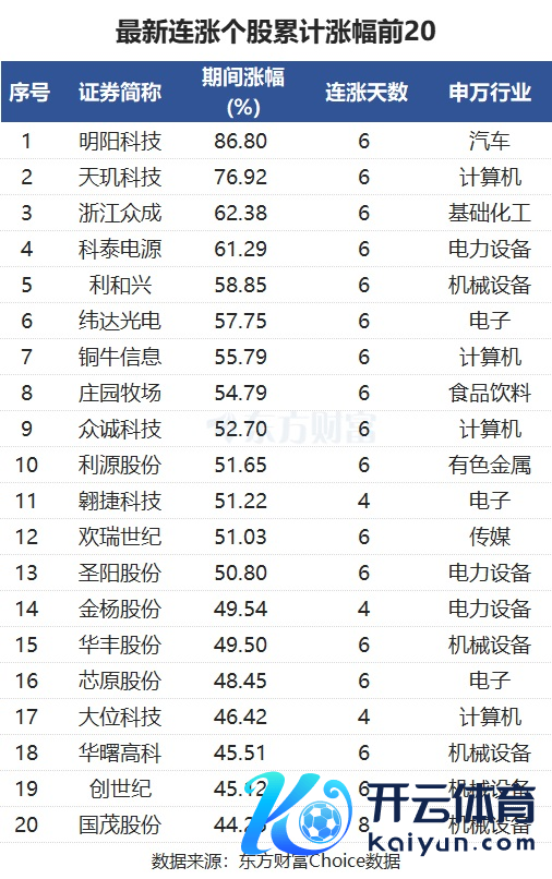 从股价涨幅来看,6连涨的明阳科技,累计高潮86.8%。天玑科技紧随后来,6天累计高潮76.92%。浙江众成、科泰电源(维权)、利和兴等也涨幅居前。