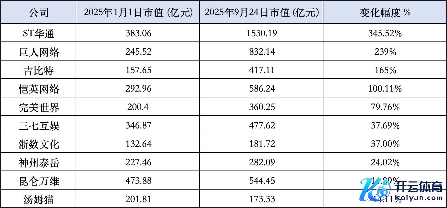 《逐日经济新闻》记者梳理数据发现,对比2025年1月1日与9月24日A股市值排名前10的重点游戏公司情况,无数企业终了市值斥地。其中,部分头部企业如世纪华通、巨东说念主网罗、吉比荒芜市值涨幅显着,但也有企业出现市值下滑,行业“马太效应”抓续突显。