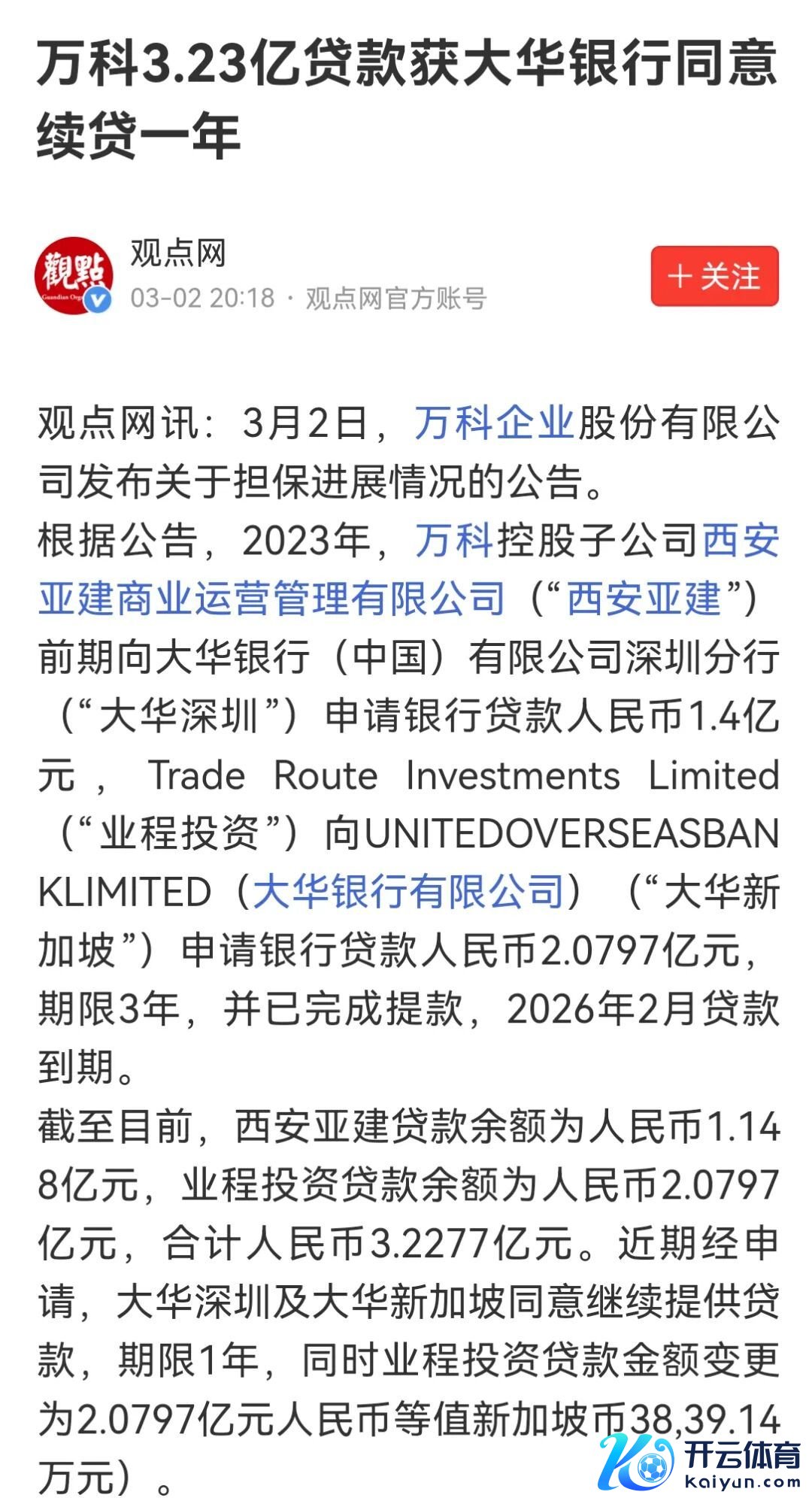 2023年,万科控股子公司西安亚建向大华银行(中国)深圳分行央求了一笔1.4亿元东谈主民币贷款,而另一家控股子公司业程投资则向大华银行新加坡分行央求了一笔等值约2.0797亿元东谈主民币的贷款。两笔贷款期限均为3年,况且皆完成了支款。
